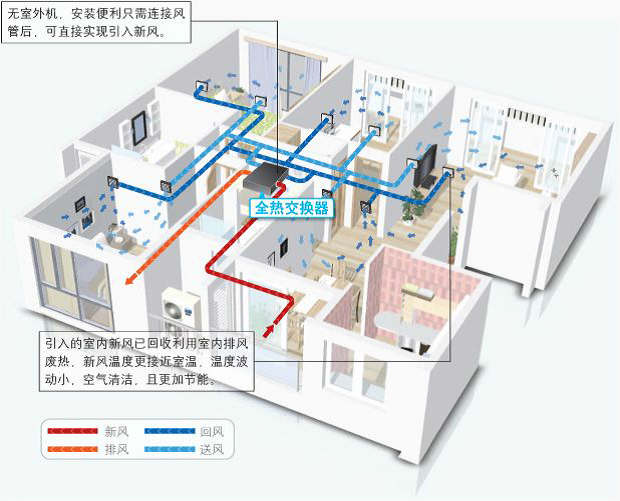 具備熱交換特點,在引進新風和排除渾濁空氣的同時通過熱交換降低熱量和冷量的損失,室內(nèi)溫度波動不大,但是需要預埋管道,安裝相對來說比較麻煩。