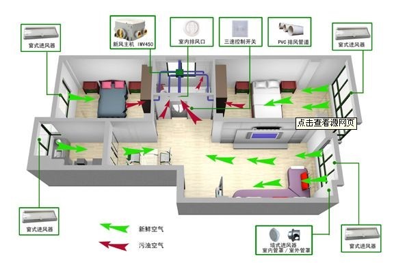 其工作原理為“強制排風,自然進風”,即由安裝在浴室衛(wèi)生間等吊頂上方的新風機持續(xù)向外排風,使室內(nèi)產(chǎn)生負壓;在負壓源的引導下,室外新風經(jīng)安裝在客廳、餐廳、臥室、書房等處外墻或窗戶上的進風口進入室內(nèi)。